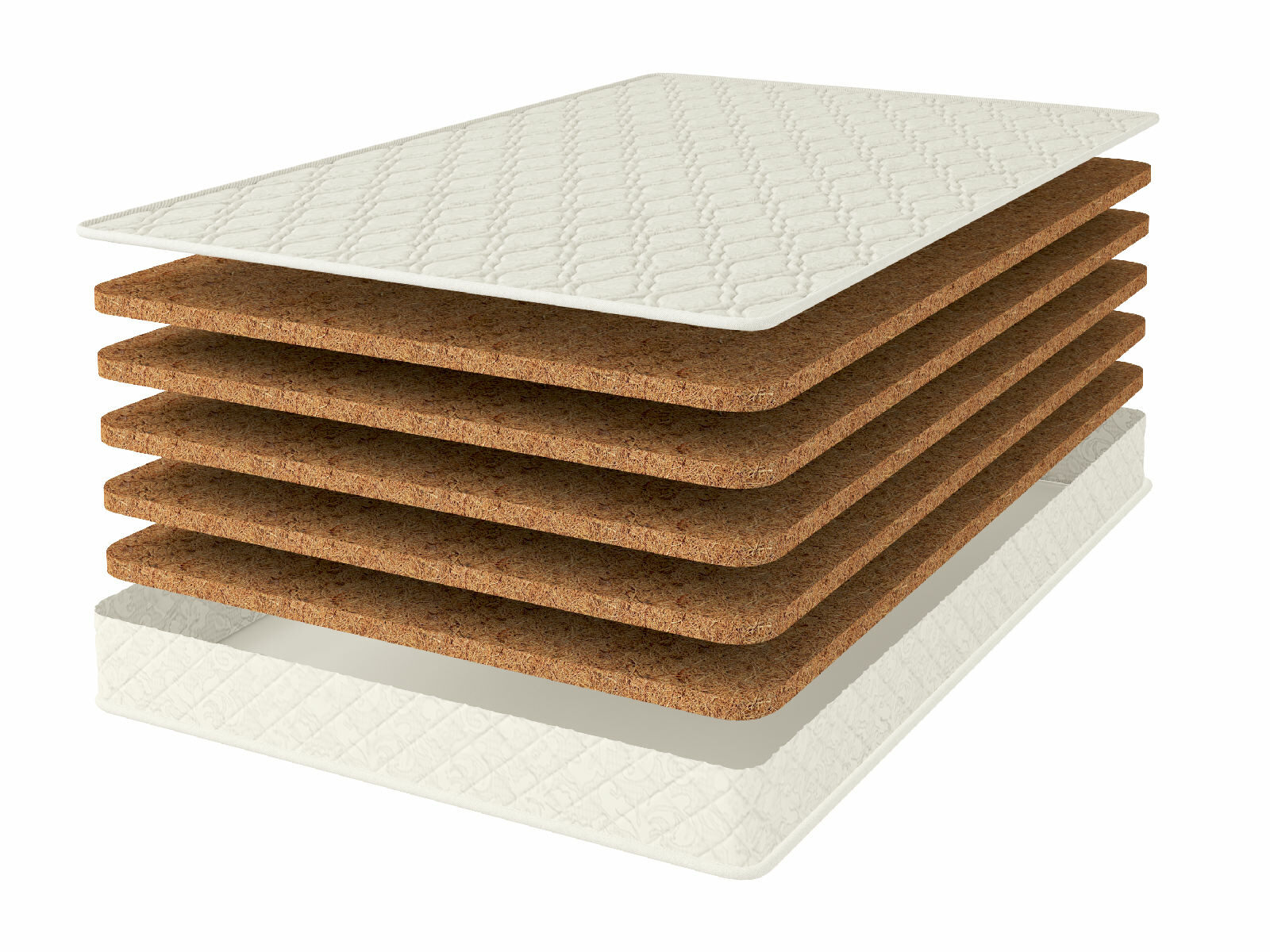 Внутри модели размещена только кокосовая койра со специальной латексной пропиткой. Это делает плиты более гибкими и прочными. Они точнее подстраиваются под изгибы тела, обеспечивая тем самым не только комфортное, но и анатомически правильное положение позвоночника. Кроме того, латексная пропитка слоя не позволяет проникать пыли и влаге внутрь матраса.