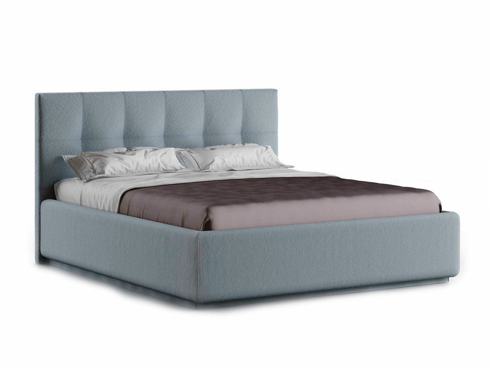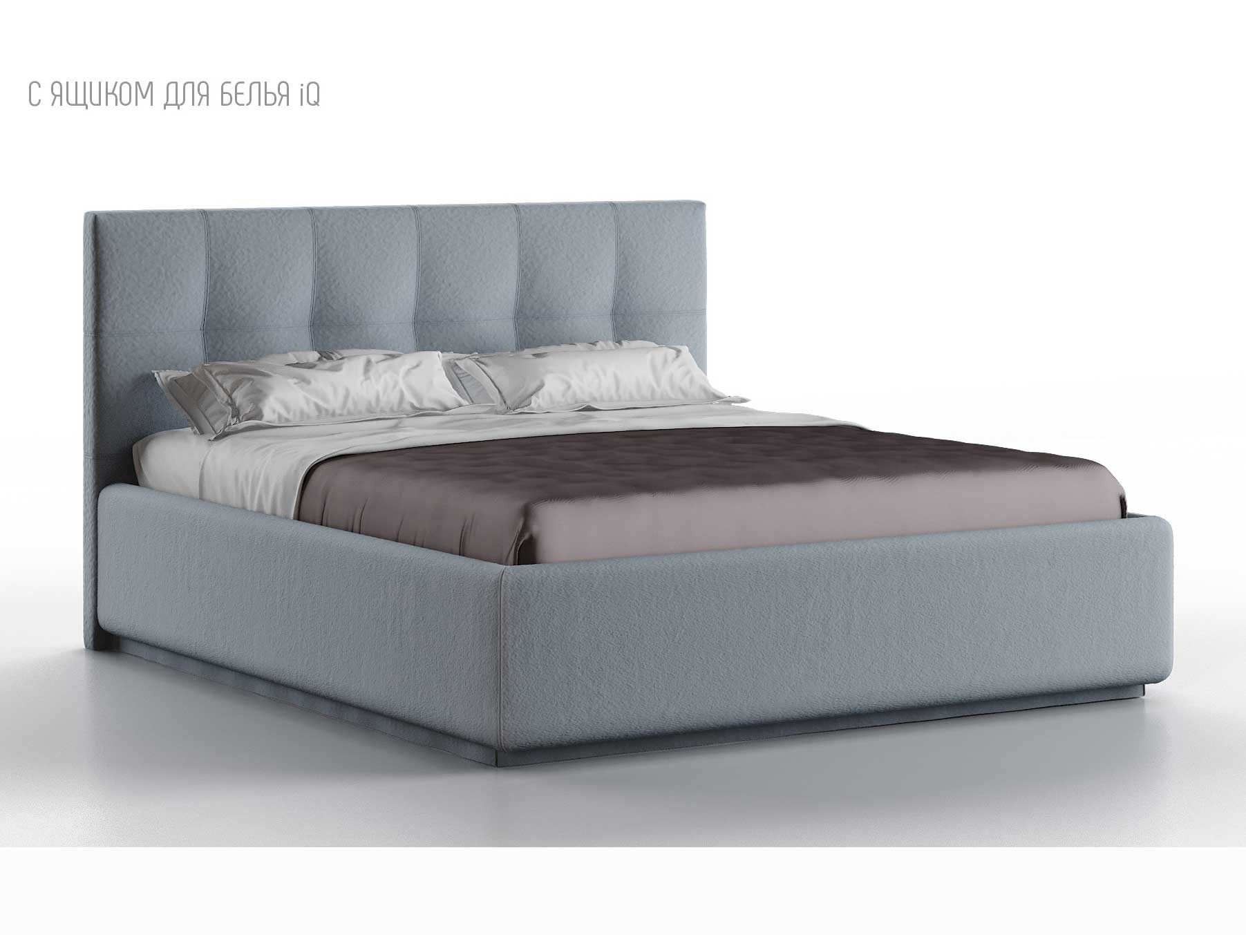 Кровать укомплектована IQ с подъемным механизмом и ящиком для белья без дна (дополнительная платная опция - дно к ящику IQ из HDF (ХДФ). Каркас кровати на цоколе, декоративный чехол на цоколе съёмный. Глубина ящика для белья - 30 см, без ограничения нагрузки на ящик.