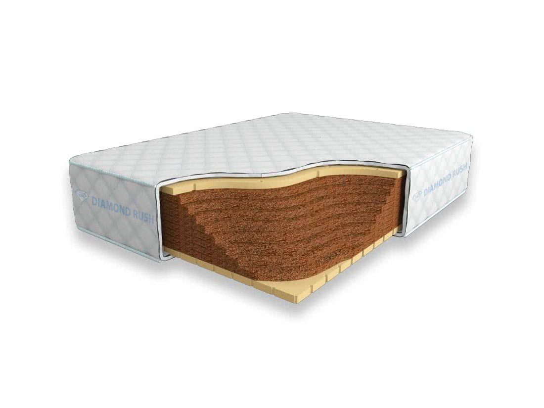 Матрас Diamond Rush Cocos Lite 30 DR является беспружинным. В основе модели идут кокосовые плиты, сверху и снизу для большего комфорта и придания средней жесткости прокладываются листы по 3см натурального перфорированного латекса.
