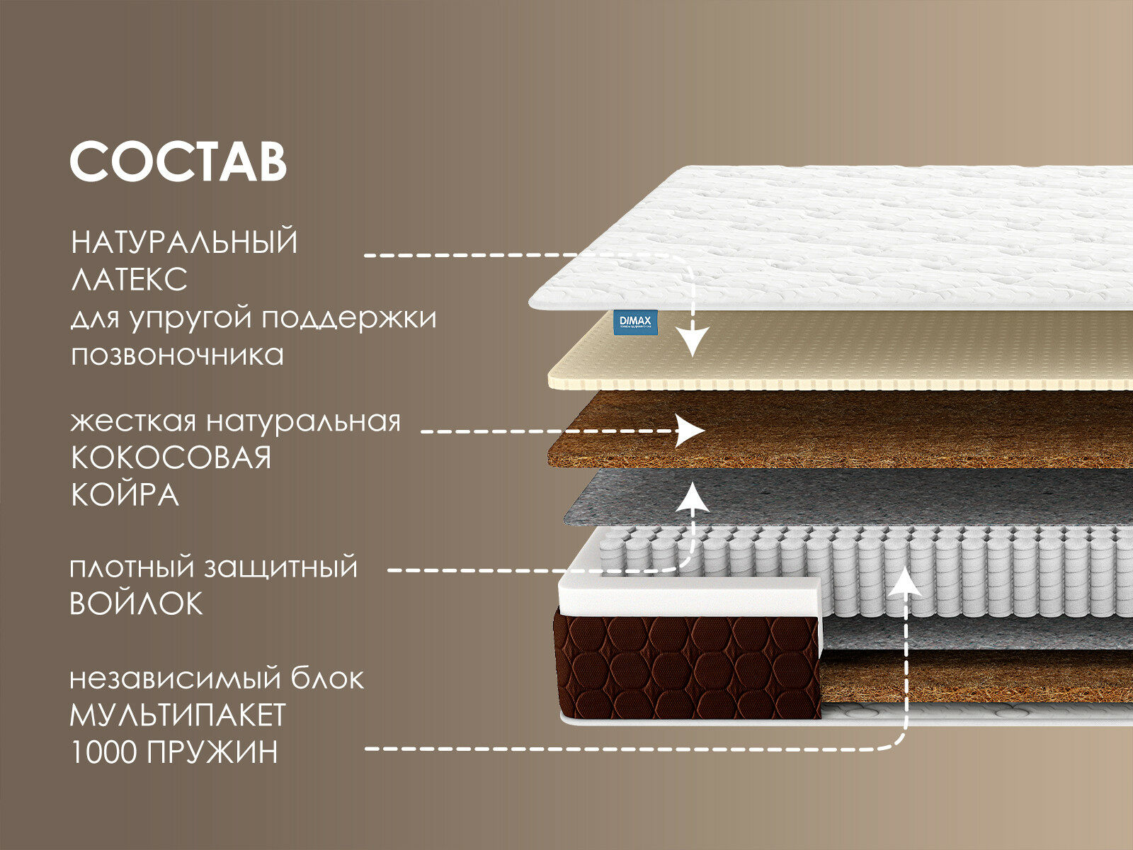 Димакс Мега Хард Лайт Плюс — пружинный матрас, объединяющий натуральные материалы и инженерные технологии для безупречной поддержки позвоночника. Многослойная конструкция из натурального латекса, кокосовой койры и блока S1000 создает баланс между экологичным комфортом и ортопедической жесткостью, выдерживая рекордную нагрузку до 150 кг на спальное место.