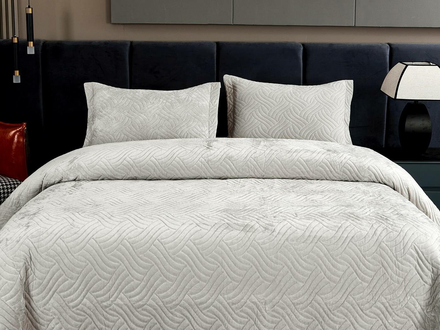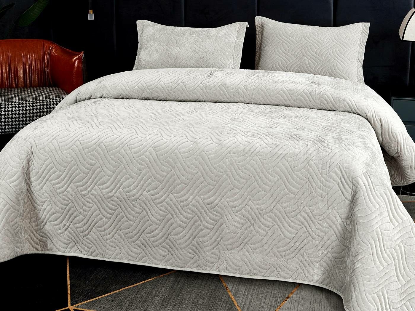 Покрывала «Деварта»: нежность и уют в вашем доме Окунитесь в мир комфорта и изысканности с новой коллекцией мягких бархатных покрывал «Деварта». Эти изделия станут настоящим украшением вашей спальни, добавив ей уюта и элегантности. Покрывала изготовлены из высококачественного бархата, который приятен на ощупь и обладает нежной бархатистой текстурой. Они устойчивы к износу и надолго сохраняют свой привлекательный внешний вид, яркость цвета и мягкость. Благодаря прочной и качественной декоративной стёжке «косичка» наполнитель надёжно зафиксирован внутри изделия. «Деварта» представлена в пяти оттенках: от тёплого бежевого до спокойного серо-голубого. Вы сможете подобрать идеальный вариант для вашего интерьера. Размерный ряд включает два варианта, что позволяет выбрать покрывало, которое идеально подойдёт для вашей кровати или дивана. В комплект входят две наволочки размером 50х70 см. Каждое покрывало аккуратно обшито кантом, а наволочки украшены милыми ушками шириной 5 см. Это придаёт изделиям особый шарм и делает их ещё более привлекательными. Не упустите возможность приобрести эти замечательные покрывала и создать в своём доме атмосферу тепла и уюта. «Деварта» подарит вам не только эстетическое наслаждение, но и незабываемые ощущения при каждом прикосновении.