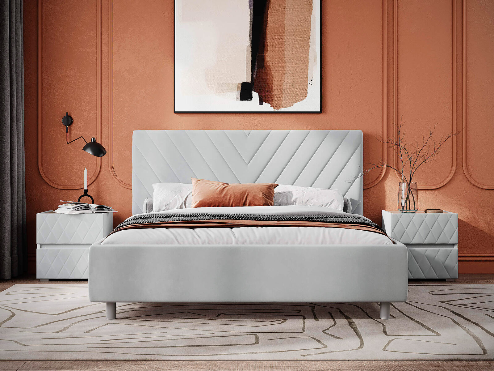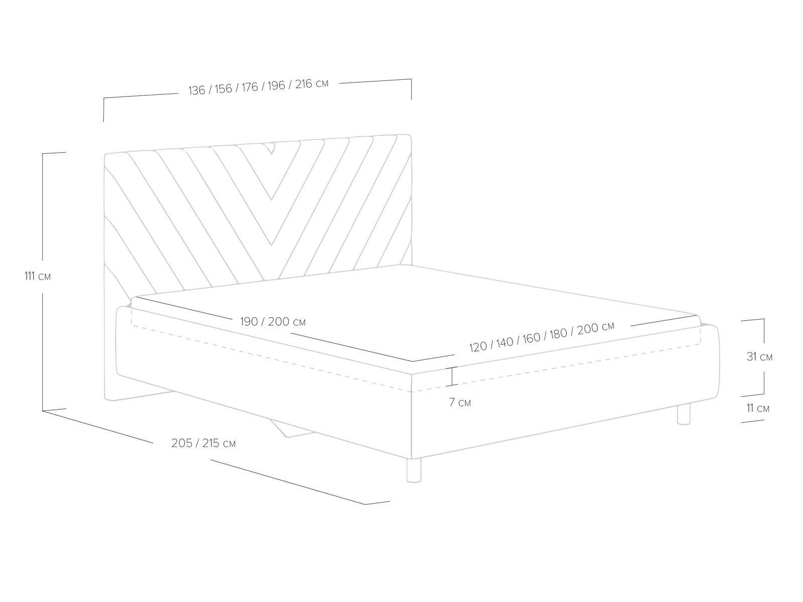 Кровать с мягким стеганым изголовьем, украшенная элегантными геометрическими линиями, придаст изысканность и уют спальному месту. Отлично впишется в большинство современных интерьеров. Увеличенный просвет от пола позволяет облегчить уборку под кроватью, в том числе роботом–пылесосом. Царги кровати выполняются по технологии съемного чехла. При необходимости кровать может быть укомплектована трансформируемым основанием Aquarius.
